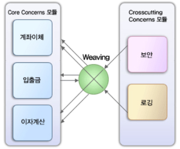 위빙(Weaving) : CrossCutting이라고도 함. AOP가 핵심 관심 모듈의 코드를 직접 건드리지 않고 필요한 기능이 작동하도록 함.