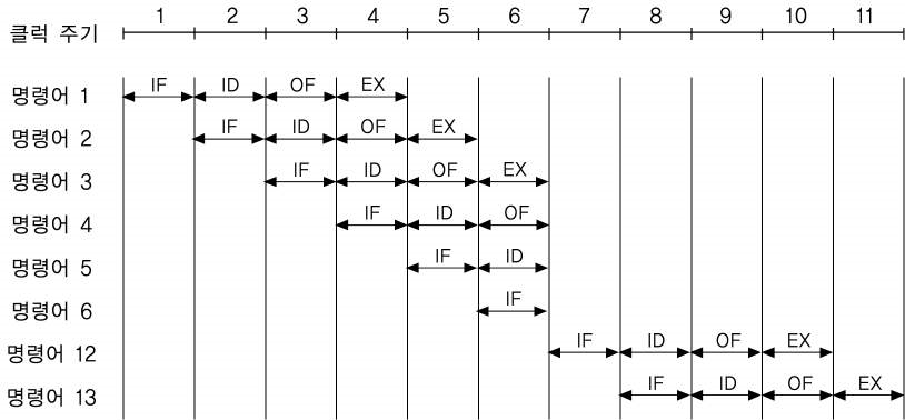 IF 단계와 OF 단계가 동시에 기억장치를 액세스하는 경우에 기억장치 충돌(memory conflict)이 일어나면 지연이 발생한다