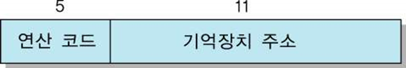 길이가 16 비트인 1-주소 명령어에서 연산 코드가 5 비트일 때의 명령어 형식을 정의하고, 주소지정 가능한 기억장치 용량을 결정하라